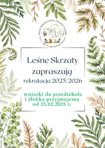 Zapraszamy do udziału w rekrutacji do przedszkola i żłobka!Harmonogram rekrutacji oraz dokumenty do pobrania w zakładce REKRUTACJAWnioski dostępne są również w wersji papierowej w siedzibie przedszkola i żłobka na ul. Baśniowej 5.Dokumenty przyjmujemy od wtorku 25 lutego 2025 r.