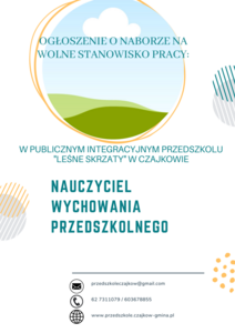 Zatrudnimy nauczyciela wychowania przedszkolnego. Szczegóły w załączonym pliku.