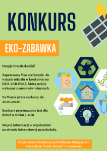 Zapraszamy wszystkie dzieci w wieku przedszkolnym do udziału w konkursie na eko - zabawkę. Szczegóły w załączonym regulaminie.