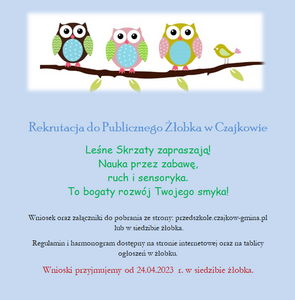 Zgodnie z harmonogramem rekrutacji do Publicznego Integracyjnego Przedszkola "Leśne Skrzaty" w Czajkowie trwa rekrutacja uzupełniajaca. Zapraszamy do naszej placówki.
