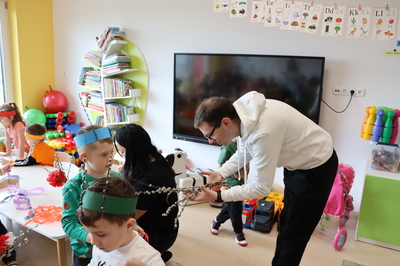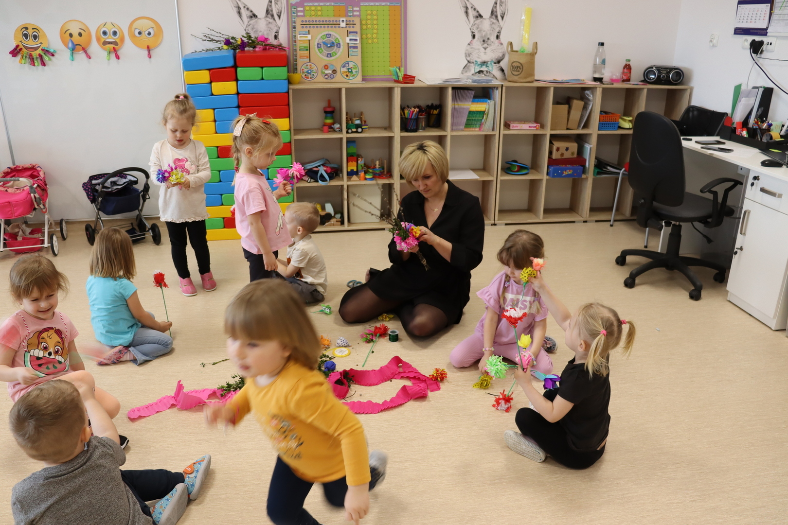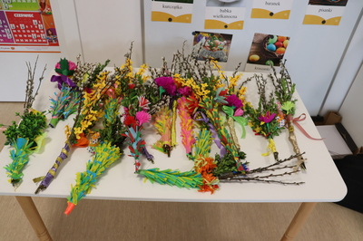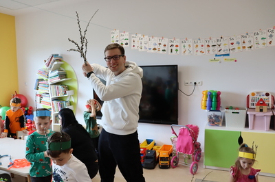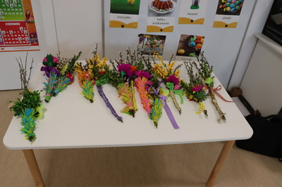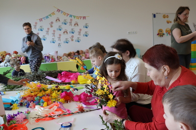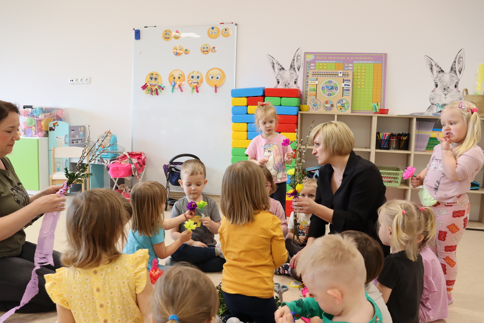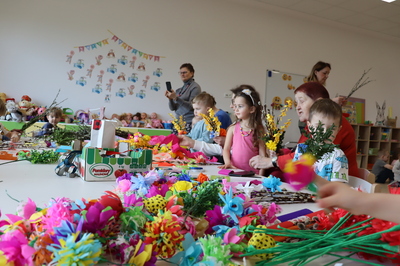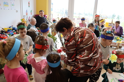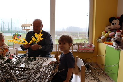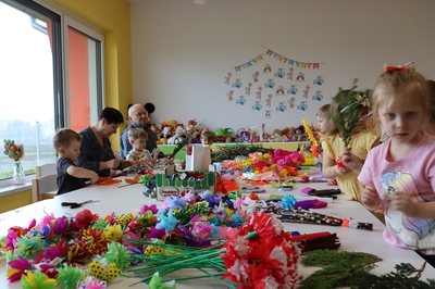 Wielkanoc zbliża się wielkimi krokami, już wkrótce będziemy obchodzić Niedzielę Palmową zwaną również Wierzbną lub Kwietną. Zwyczaj dekorowania palmy nie jest obcy Leśnym Skrzatom z Baśniowej, które wspierane przez Seniorów aktywnie uczestniczyły w warsztatach wielkanocnych. W tym roku gośćmi przedszkolaków byli zarówno członkowie Klubu Senior+ z Mielcuch, jak i z Głuszyny. Pani Bożena Wysota oraz Anna Tokarek zorganizowały zacną grupę utalentowanych, pełnych wigoru i radosnych Seniorów, którzy zaangażowali dzieci do wspólnej pracy. A że nie samą pracą żyje człowiek, tudzież Skrzat, warsztatom towarzyszyły pogodne rozmowy, śpiewy, a nawet tańce i zabawy w kole. Tradycyjnie członkowie Klubów Senior+ przygotowali część kwiatów i roślin do dekoracji, w tym roku gałązkami palmowymi wsparli nas również nasi Rodzice. Powstało całkiem sporo barwnych bukietów, które już wkrótce będziemy mogli zanieść do kościoła, a następnie do domu. Ilu z Was ustawia palemki w kątach wnętrz albo na parapetach? A może ktoś wsuwa za róg obrazu? Mamy nadzieję, że zwyczaj ten przetrwał i jeszcze wielu z nas wierzy, że w ten sposób chroni domostwo przed chorobami czy piorunami. A czy są tacy, którzy smagają ramiona palmami, by zachować zdrowie i siły witalne? Być może w tym roku ktoś wskrzesi tę jakże uroczą tradycję.