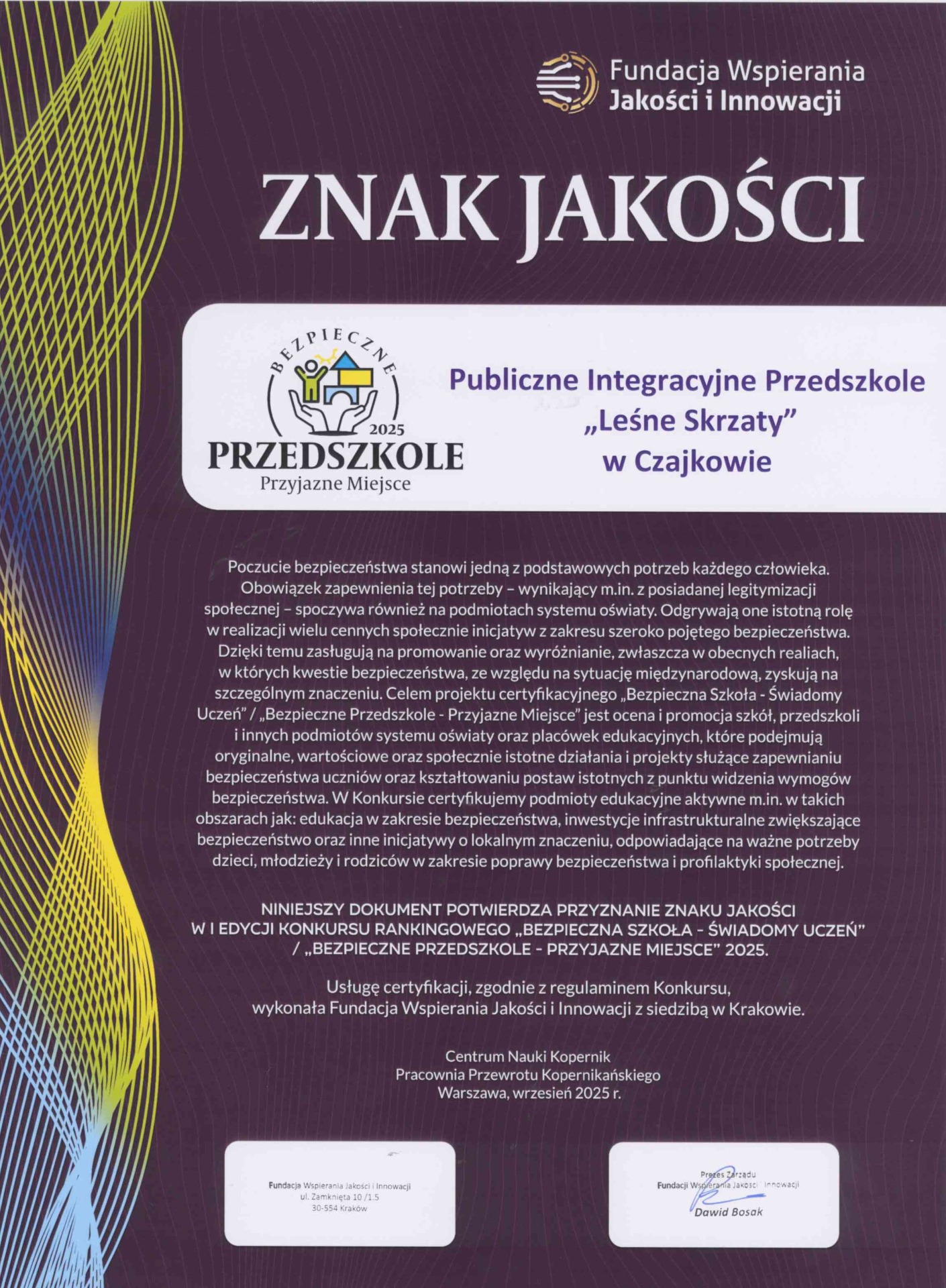 馃┓馃┓馃┓Z ogromn膮 dum膮 i rado艣ci膮 dzielimy si臋 wiadomo艣ci膮 o przyznanym naszemu przedszkolu 馃弳馃弳Tytu艂u i Znaku Jako艣ci馃弳馃弳. Nadanie certyfikatu w Ogólnopolskim Konkursie Rankingowym "Bezpieczne Przedszkole - Przyjazne Miejsce" organizowanym przez Fundacj臋 Wspierania Jako艣ci i Innowacji to wyraz uznania recenzentów - jurorów dla podejmowanych dzia艂a艅 i realizowanych projektów na rzecz Le艣nych Skrzatów w zakresie edukacji dla bezpiecze艅stwa, rozwoju infrastruktury bezpiecze艅stwa oraz wspó艂pracy z innymi podmiotami w tym zakresie.