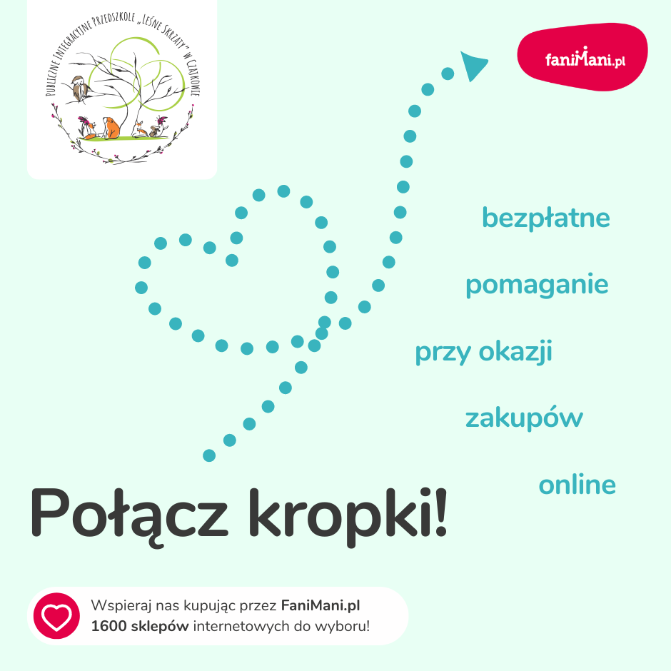 Jeżeli robisz zakupy w internecie, nieważne czy są to buty, elektronika, kosmetyki czy książki, możesz nas bezpłatnie wspierać. Z każdego Twojego zakupu średnio 2,5% jego wartości  trafi do naszej organizacji, jeśli zaczniesz korzystać z serwisu FaniMani.pl  Ty nic nie dopłacasz!
