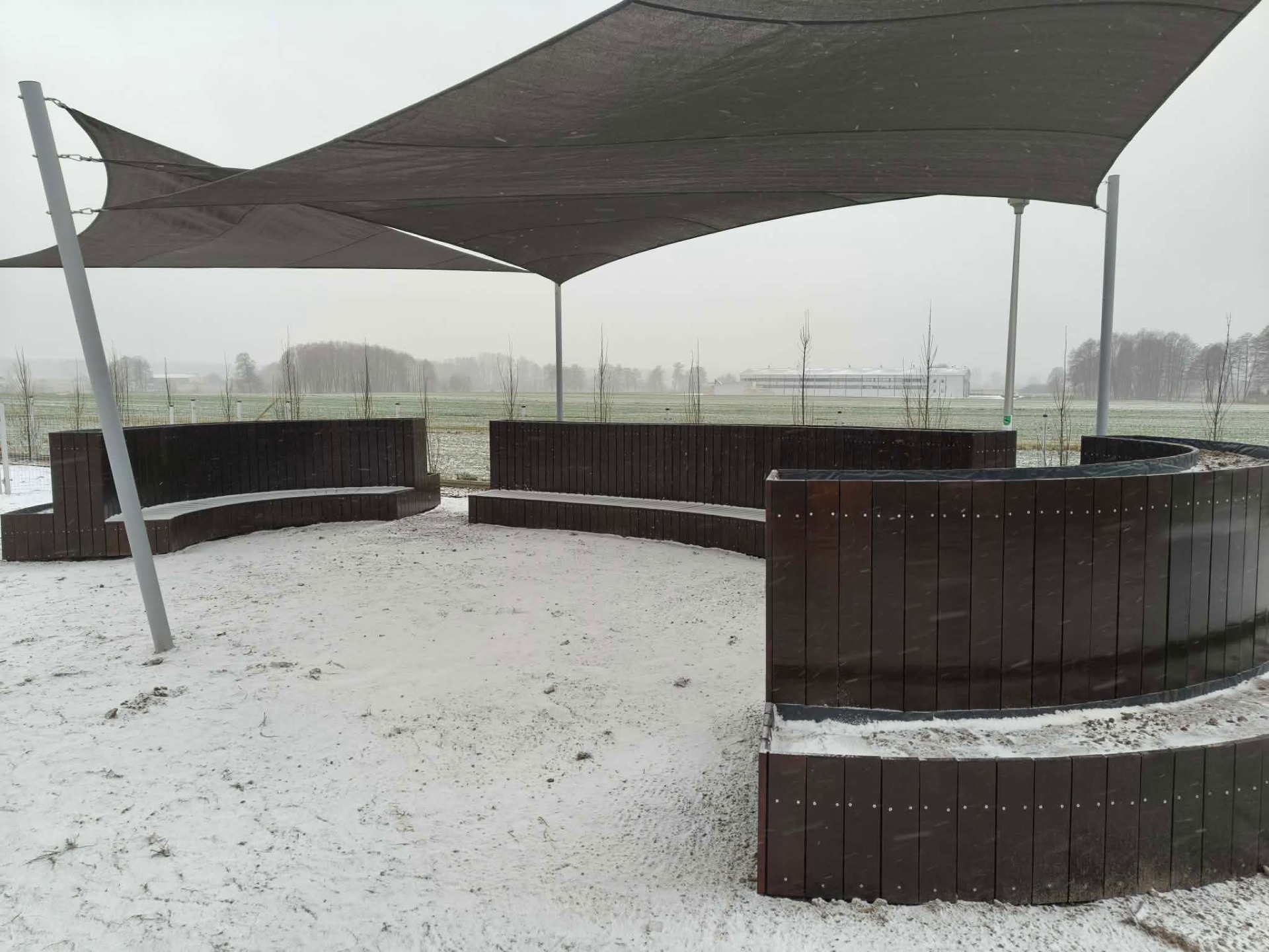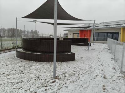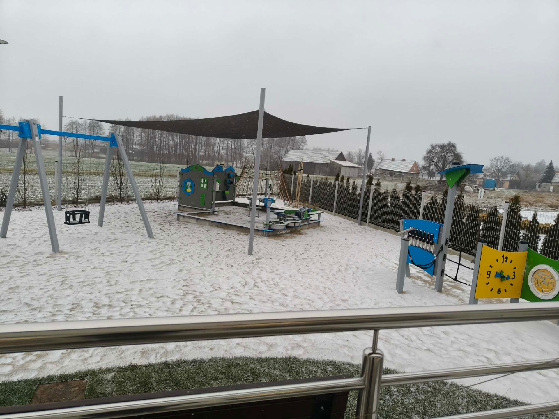 Zakres zadania obejmował przebudowę istniejącego placu zabaw oraz jego doposażenie w nowe elementy małej architektury. W ramach inwestycji zakupiono i zamontowano m.in. fabrykę piasku, niskie huśtawki z bocianim gniazdem oraz domek ze zjeżdżalnią i strefą manipulacyjną. Wykonano również strefę relaksu zadaszoną żaglami, opartą na metalowej konstrukcji obudowanej drewnem. Zewnętrzne siedziska pełnią jednocześnie funkcję donic, które w okresie wiosennym zostaną obsadzone roślinami zielonymi oraz ziołami, tworząc wertykalny ogród. Również część placu zabaw z urządzeniami małej architektury została zadaszona żaglami, co zwiększa komfort i bezpieczeństwo użytkowania obiektu. Dodatkowo na terenie placu zabaw wykonano naturalny szałas, zakupiono klocki konstrukcyjne oraz wyposażenie do piaskownicy. Cały teren placu zabaw został ogrodzony oraz oddzielony od części przedszkolnej.